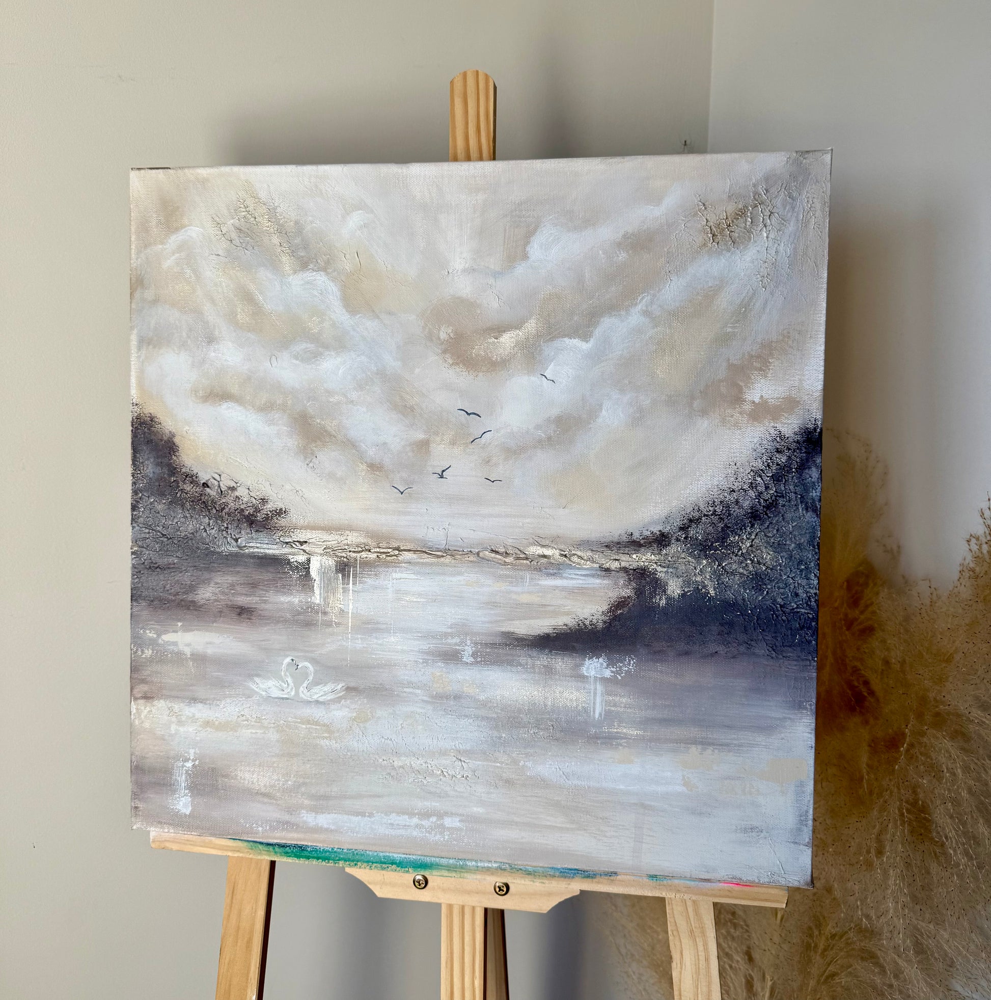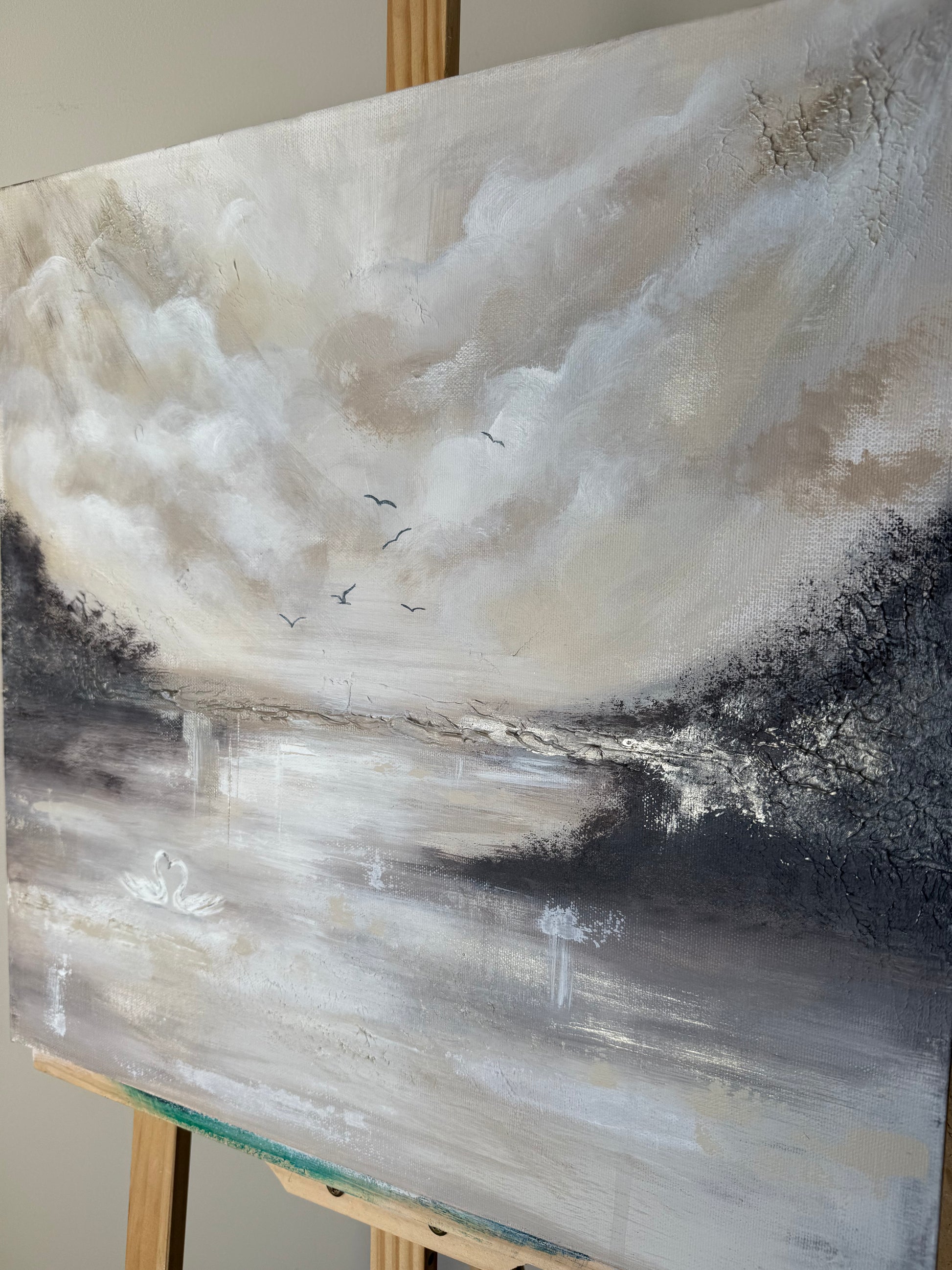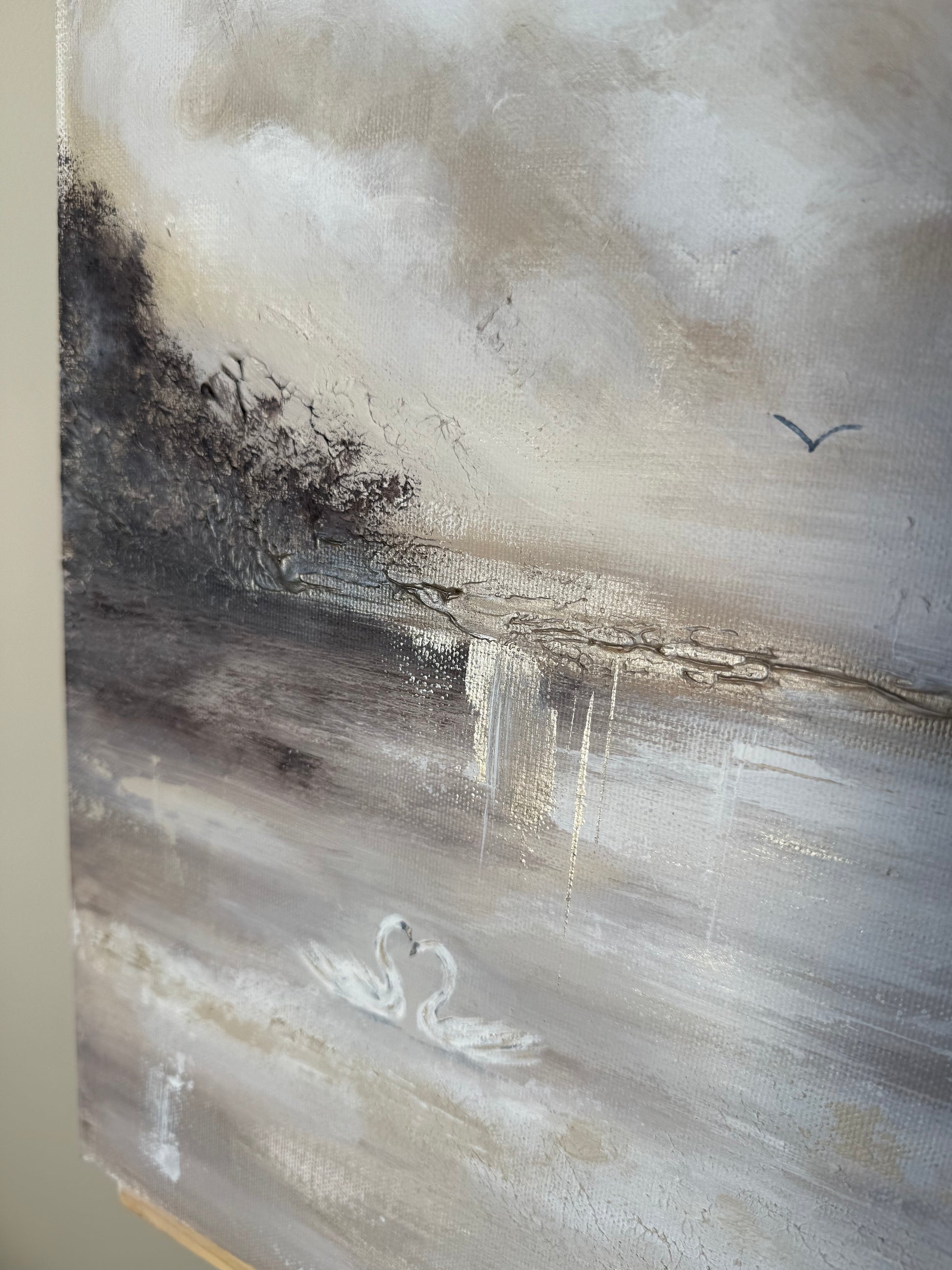 This original artwork is a textured abstract interpretation of a peaceful lake, where two graceful swans glide across the water. Painted in soft, neutral tones with touches of metallic gold, the piece captures both tranquility and elegance, with layered textures that reflect the movement and depth of water and sky. The swans emerge subtly within the abstraction, adding a delicate focal point to the composition.